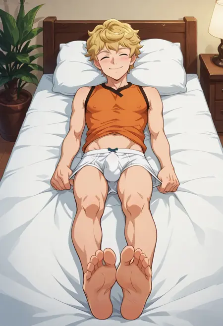 케이, 우미, 샹그릴라, 금발, 녹색 눈, 금발, 미소, 벌어진 입, 자켓, 팔을 머리 뒤로, 바지, 주황색 셔츠, 셔츠, 갈색 신발