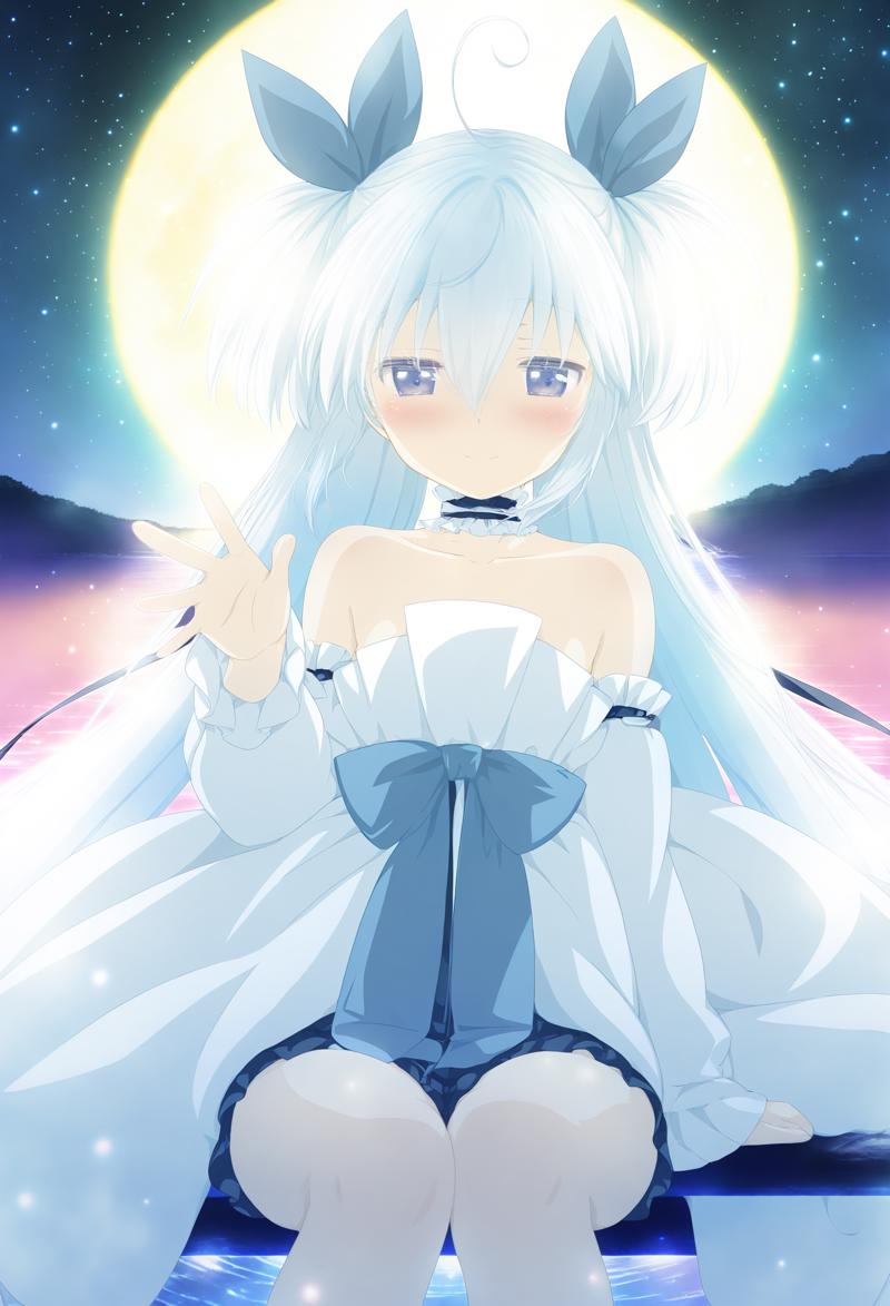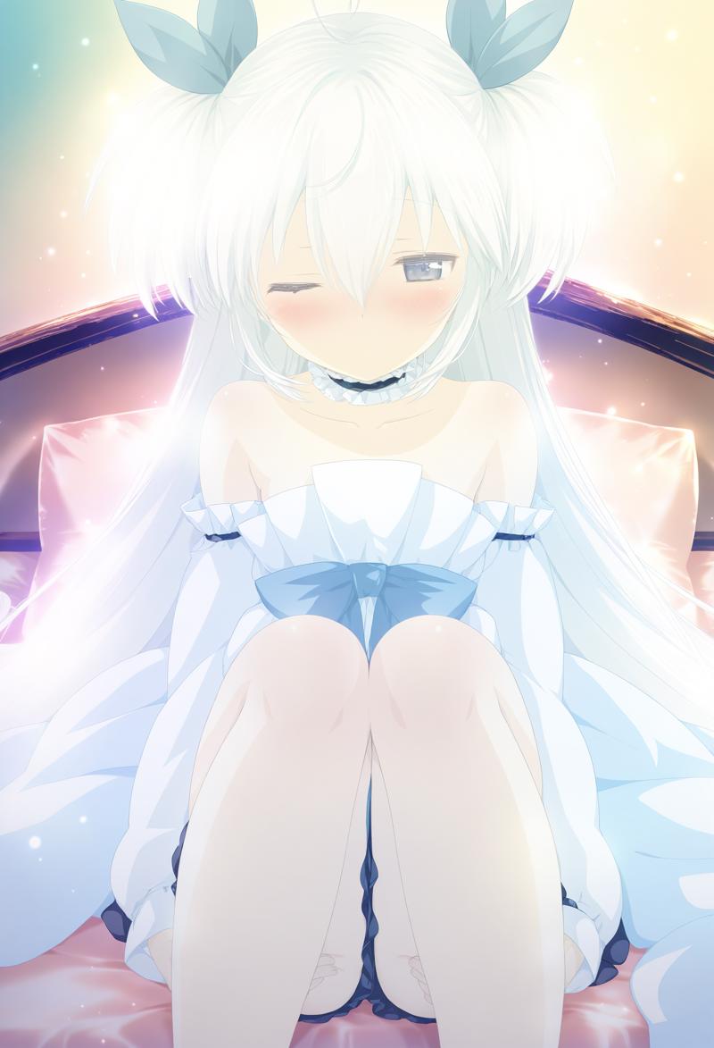 Mashiro White Dress,white dress,blue bow,detached sleeves,ribbon,bare shoulders,choker,strapless,twintails,blue hair ribbon,