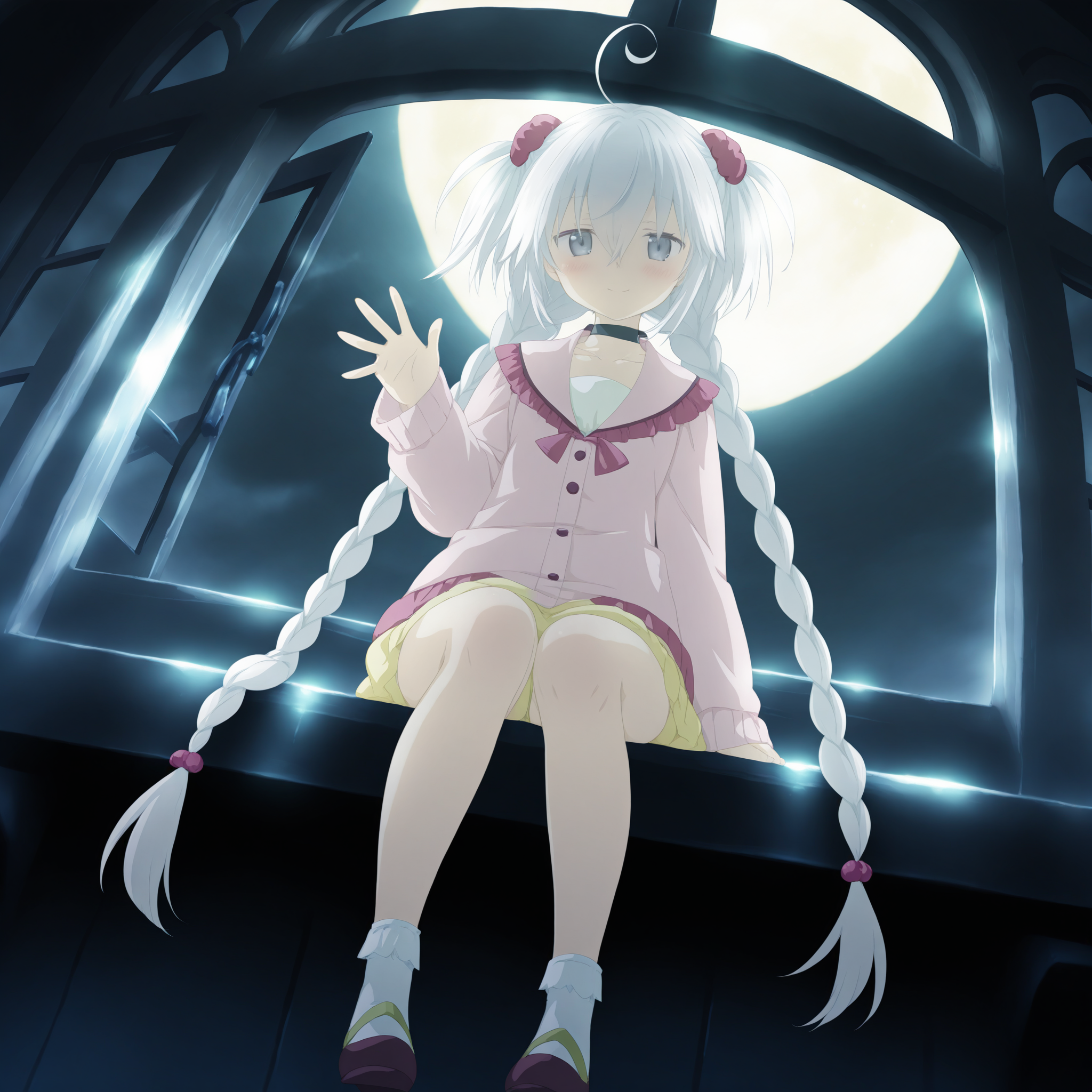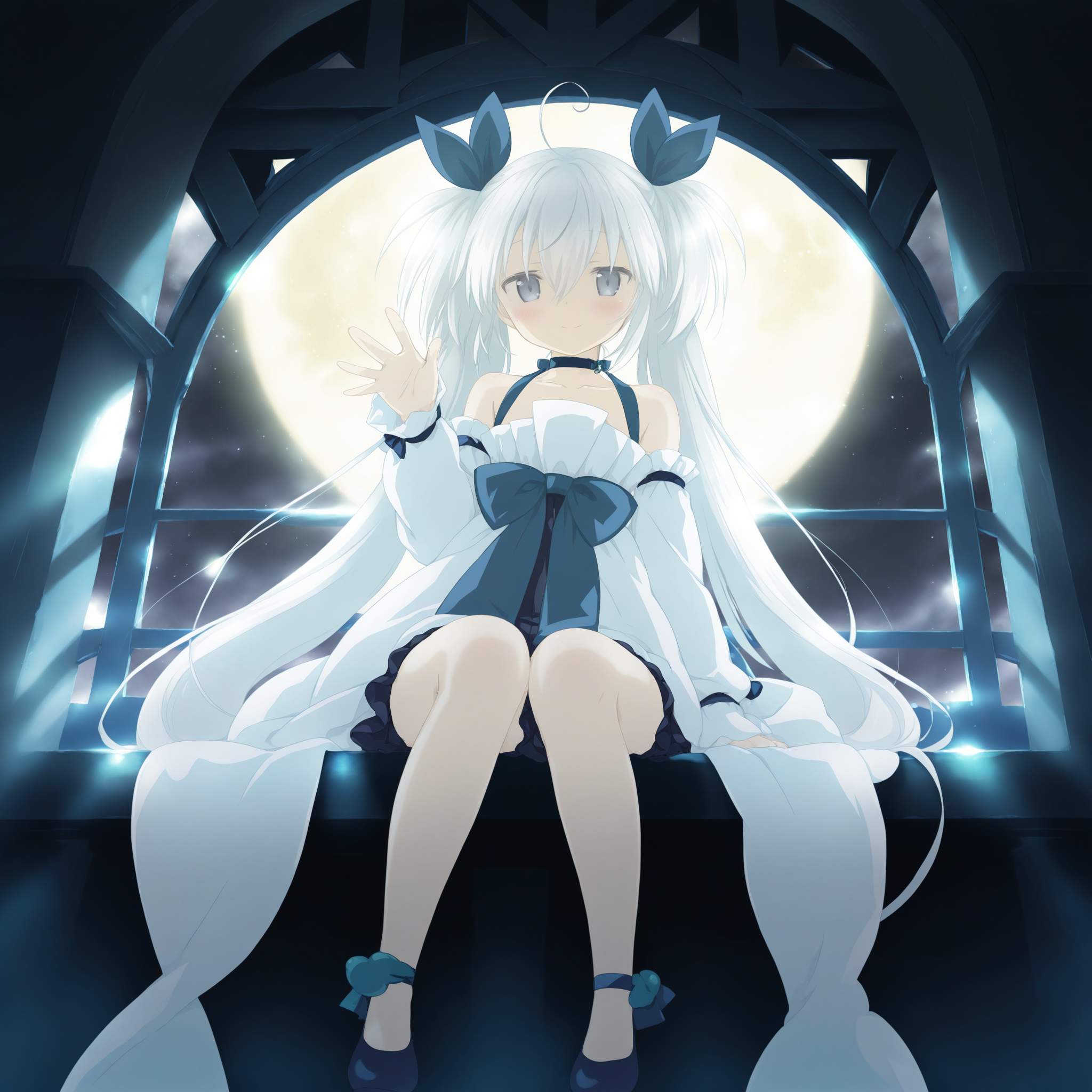 twintails,hair bow,blue bow,white dress,long dress,detached sleeves,dark blue choker,frilled choker,neck ribbon,dark blue ribbon,white sleeves,frilled sleeves,strapless dress,dress bow,puffy long sleeves,dark blue bloomers,sleeve ribbon,