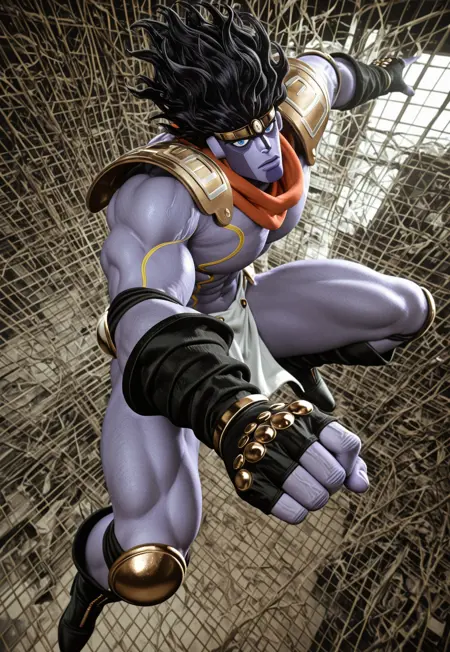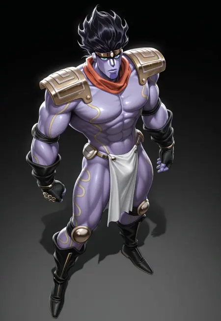 スタープラチナ、ジョジョの奇妙な冒険から! タグ: starplatinum、全身、単独、1人の男性、stand (jojo)、紫の肌、黒髪、青い目、肩甲板、スカーフ、肘当て、指なし手袋、腰巻き、膝当て、ブーツ