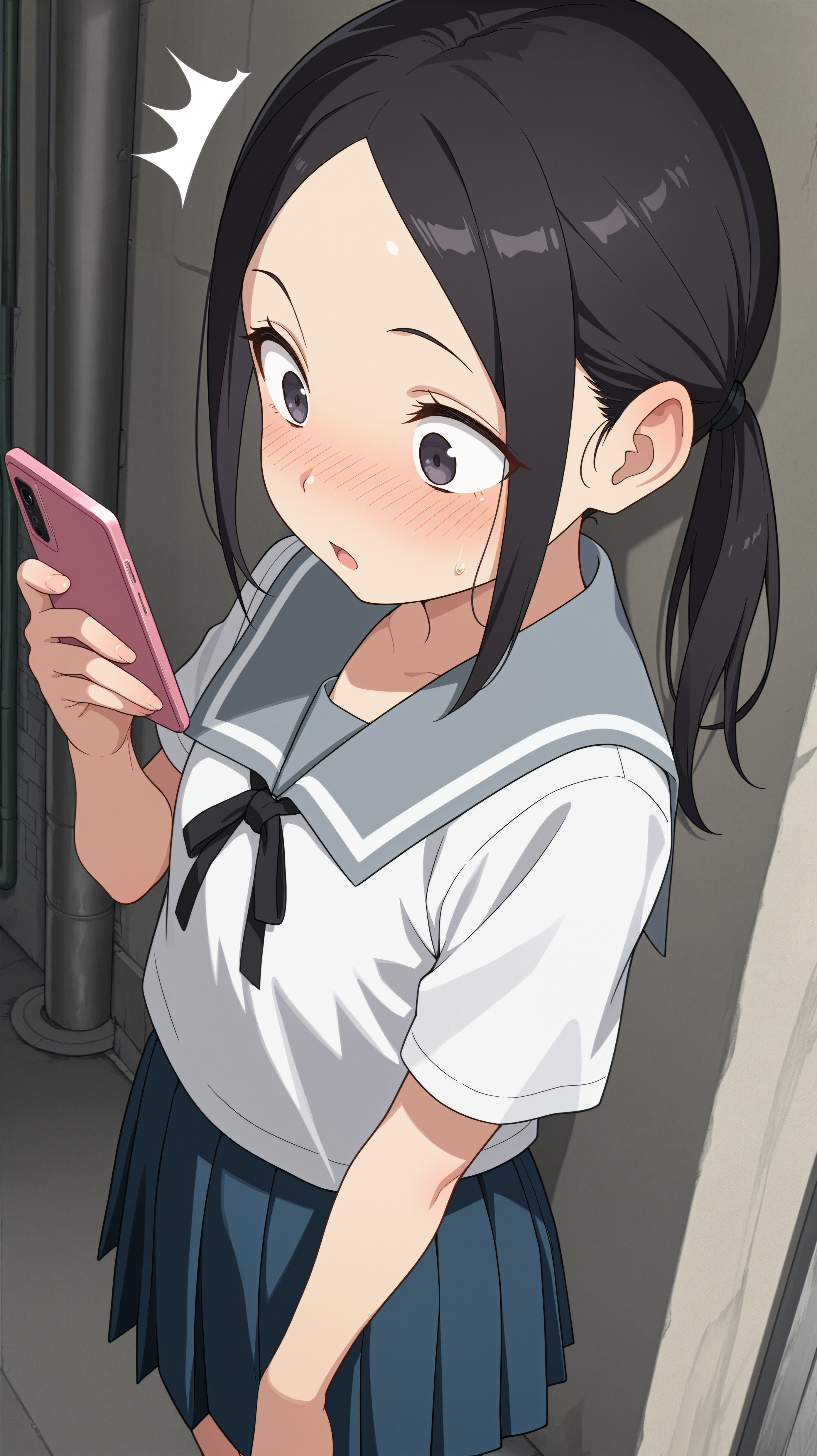black hair, dark purple eyes, sidelocks, twintails, parted hair, forehead, school uniform, grey collar, black ribbon, blue skirt, pleated skirt, nose blush,