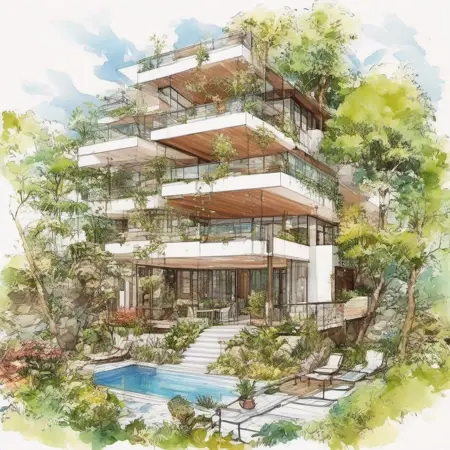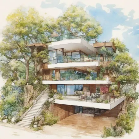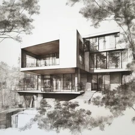 現代の住宅建築の外観デザイン。Loraは家のアーキテクチャスケッチのアイデアを生成できます。スタイルには、バルコニー、屋根、プール、窓、ドアなどのさまざまな要素や、ガラス、大理石、コンクリートなどの素材が含まれます。