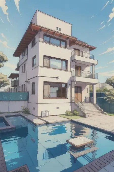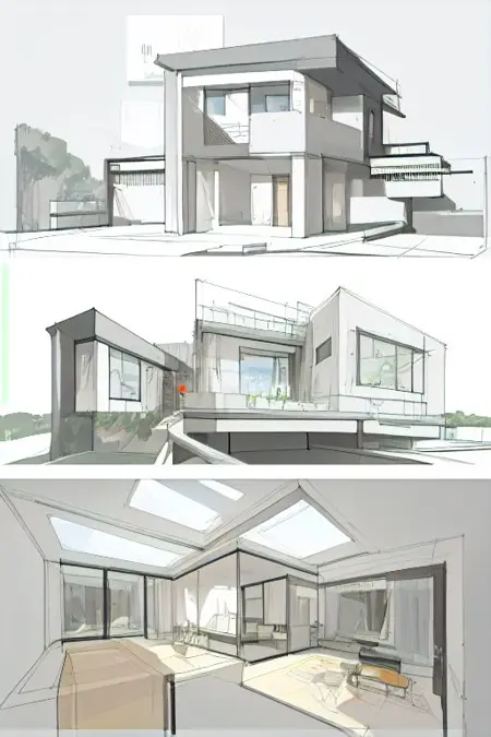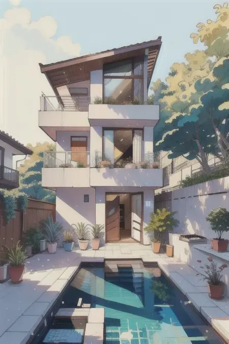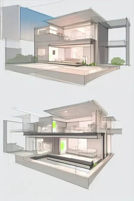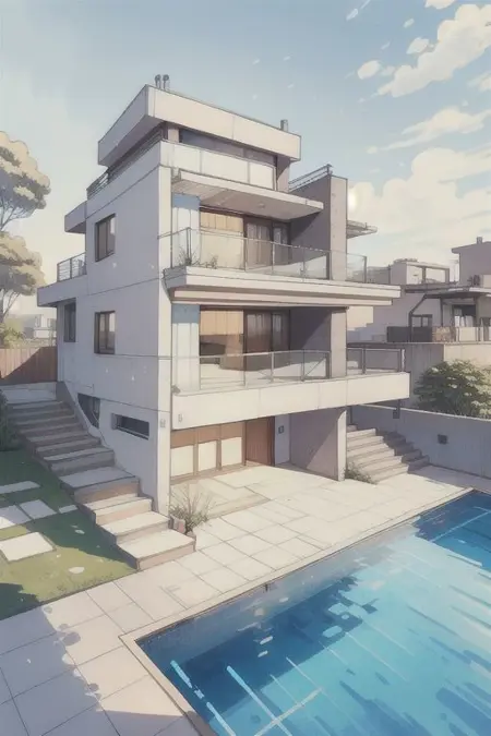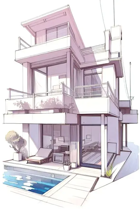 현대 주택 건축 외관 디자인. Lora는 주택의 건축 스케치 아이디어를 생성할 수 있습니다. 스타일에는 발코니, 지붕, 수영장, 창문, 문 등 다양한 요소와 유리, 대리석, 콘크리트 등의 재료가 포함될 수 있습니다.
