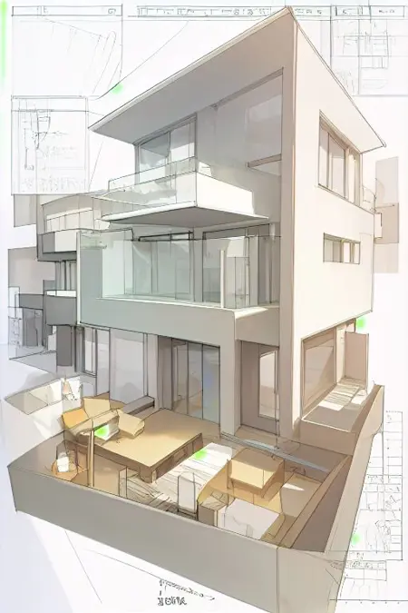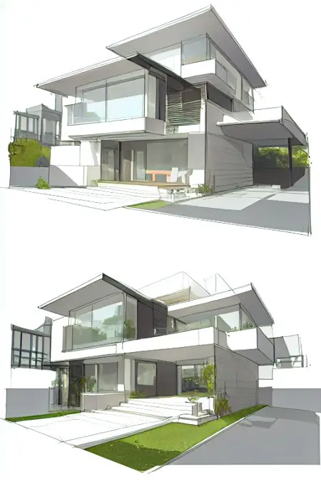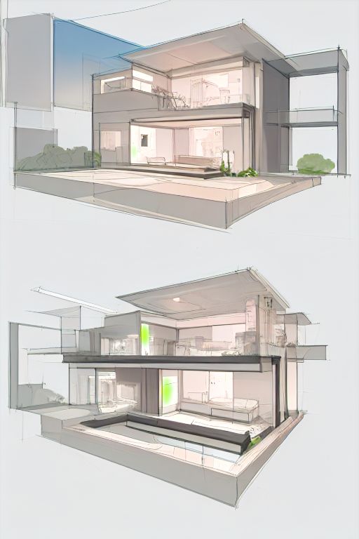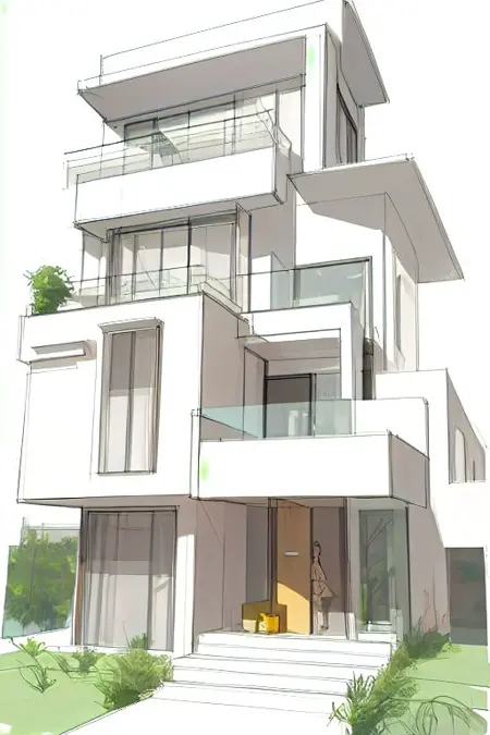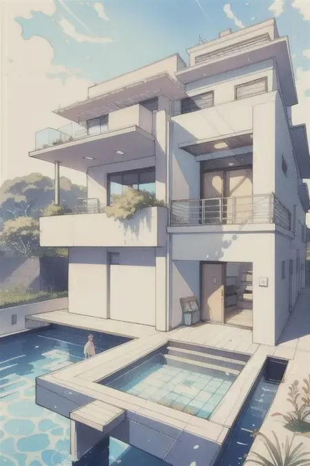 현대 주택 건축 외관 디자인. Lora는 주택의 건축 스케치 아이디어를 생성할 수 있습니다. 스타일에는 발코니, 지붕, 수영장, 창문, 문 등 다양한 요소와 유리, 대리석, 콘크리트 등의 재료가 포함될 수 있습니다.