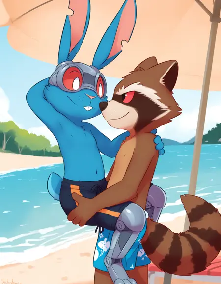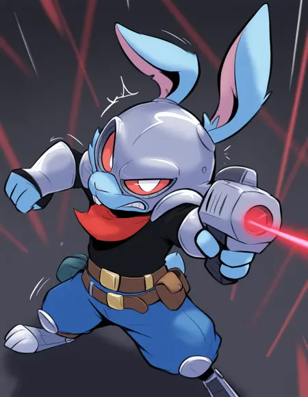 blackjack o'hare, rabbit, male, blue skin, blue body, cybernetic legs, prosthetic leg, buckteeth, goggles, metal helmet, red sclera, white eyes, notched ears, cyborg,