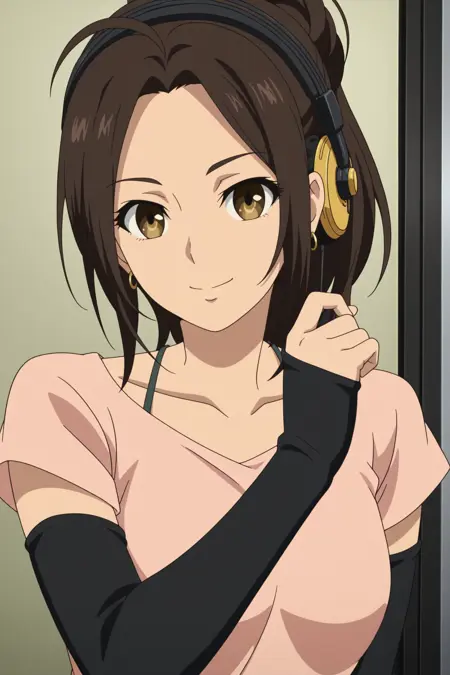 fuji askua, long hair, brown hair, high ponytail, updo, ahoge, sidelocks, parted bangs, brown eyes, earrings, short sleeves, pink shirt, camisole, black sleeves, detached sleeves, belt, green pants