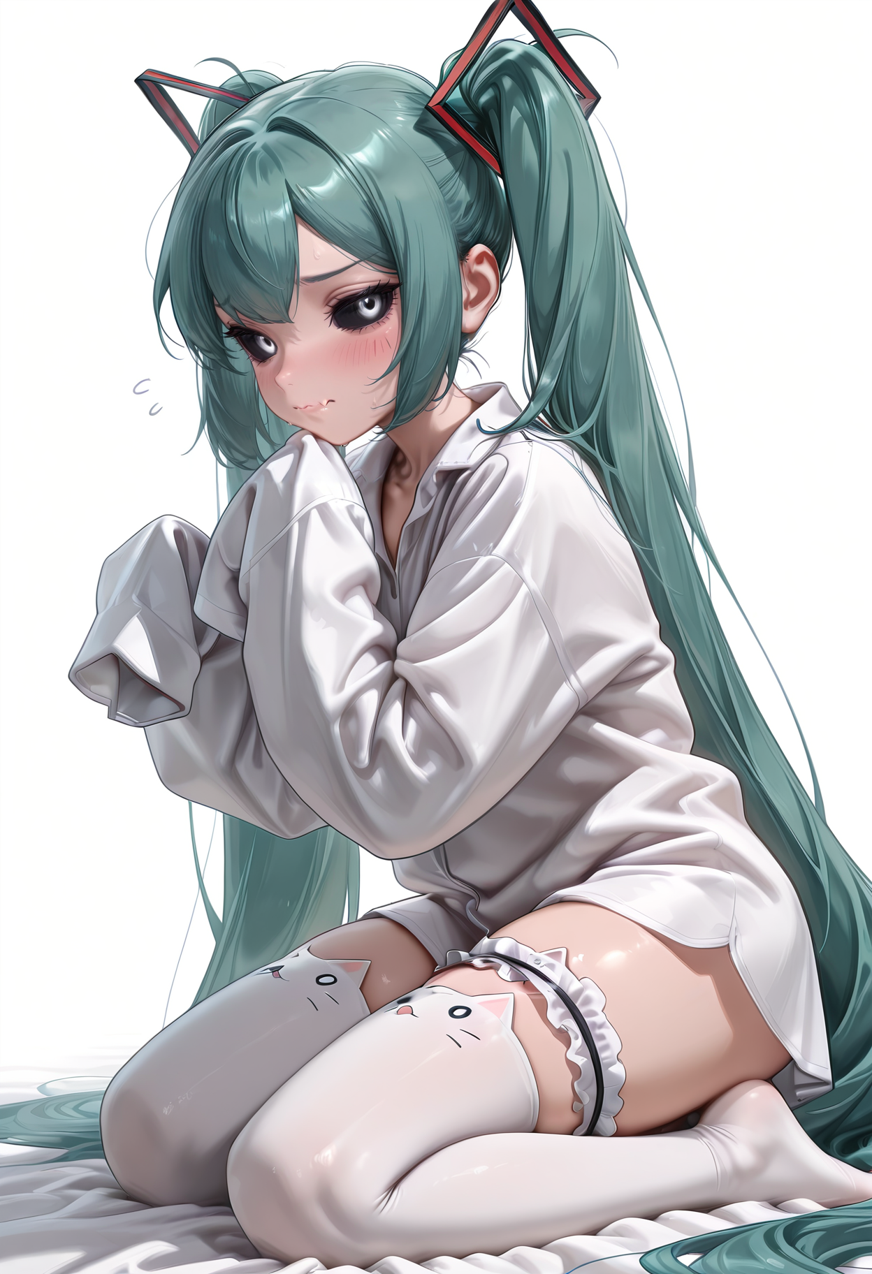 collared shirt, sleeves past wrists, white thighhighs, cat ear legwear, bridal garter, no shoes, oversized clothes,