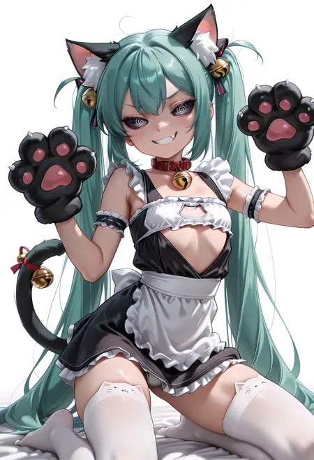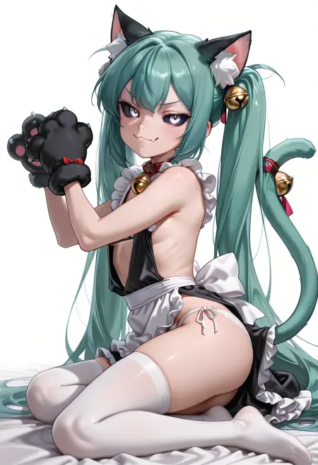 white apron, frilled apron, black dress, frills, white thighhighs, no shoes, paw gloves, jingle bell, neck bell, tail bell, tail ornament, cat ears, cat tail,