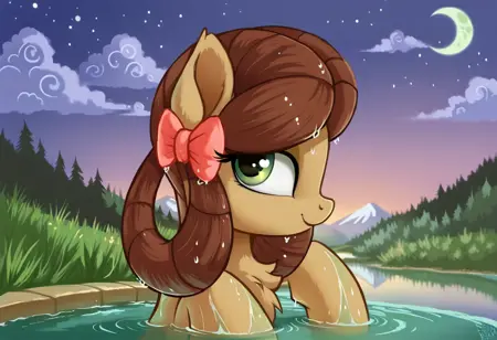 mane is styled in large, neat curls resembling ram's horns, a pink bow is attached to the side of the hairstyle