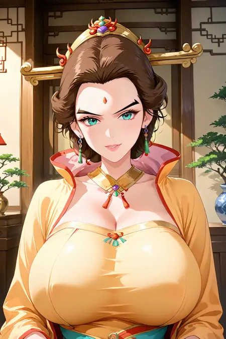 dong fang xiong, forehead mark, brown hair, sharp eyebrows, hair stick, hair ornament, earrings, jewelry, chinese clothes