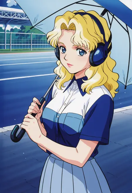 ベース:clair_gpx、1girl、アニメ風カラー、レトロなアートスタイル、シングル、ミディアムヘア、ウェービーな髪、金髪、青い目、分け目のある前髪、唇、リップスティック、青白いシャツ、ポロシャツ、短い袖、ピンクのスカート、胸ポケット、プリーツスカート、ロングスカート、中程度のバスト、青いヘッドフォン