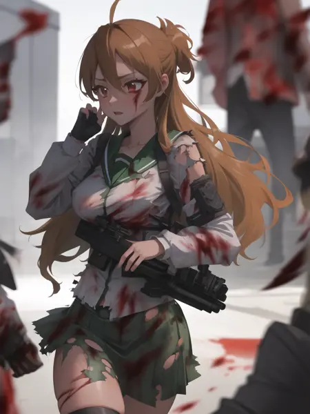 无需触发词即可生成角色。基础制服只需使用触发词 "serafuku" 即可。您也可在正向或负向提示词中添加以下标签,以获取训练数据中的不同变体:shirt, skirt, thighhighs, elbow pads, knee pads, sneakers, rifle, stick, blood, torn clothes, shoulder holster。