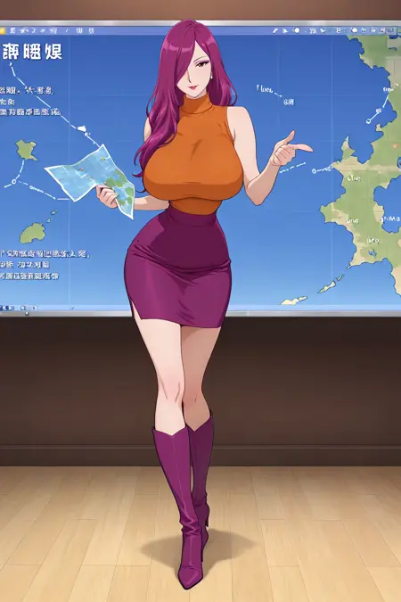 xiaomei ma, long hair, purple hair, hair over one eye, makeup, lipstick, turtleneck, orange sweater, sleeveless, purple skirt, boots, purple boots