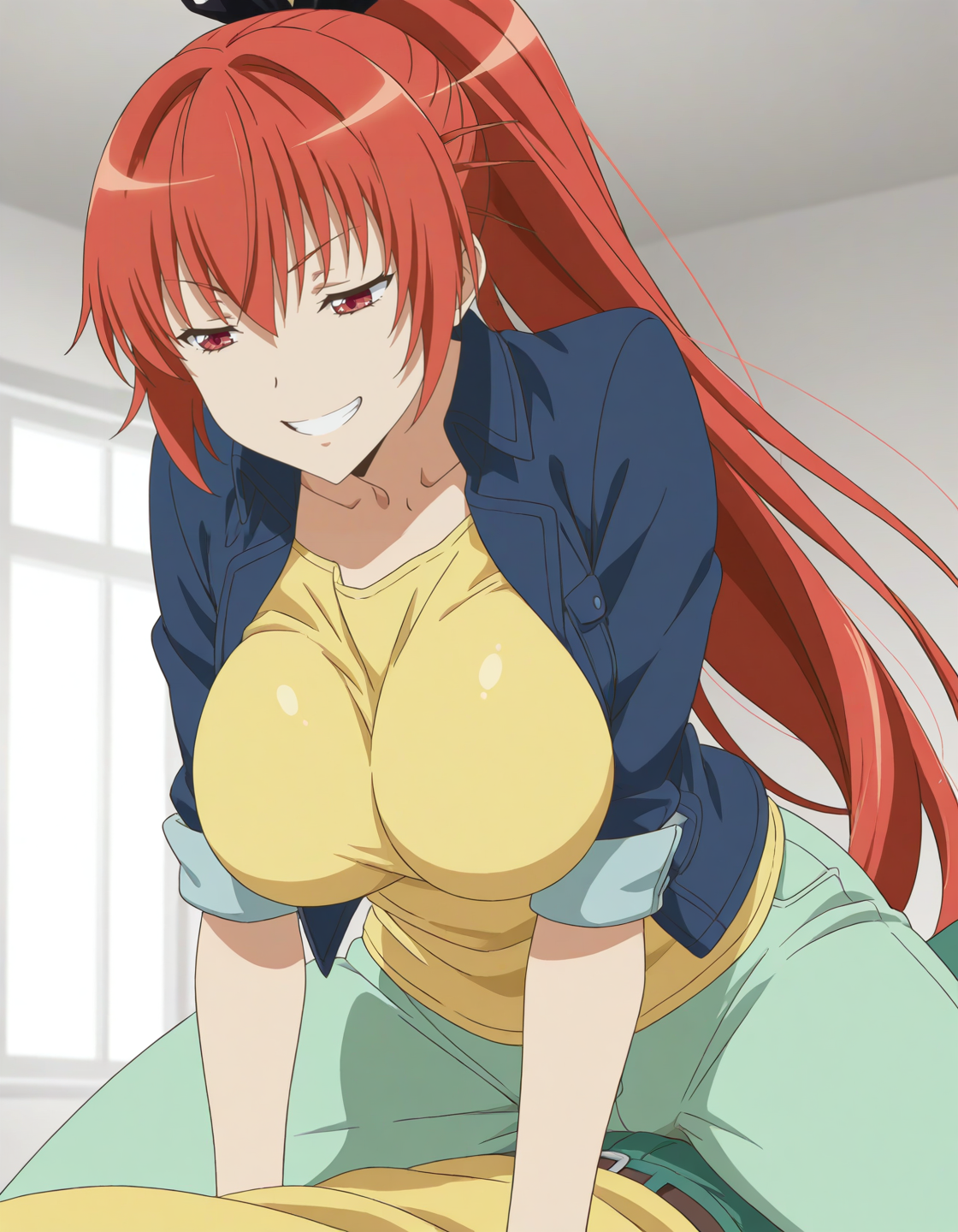 kuune, red hair, long ponytail, hair ribbon, red eyes