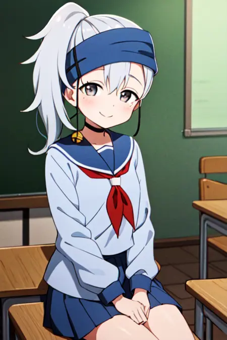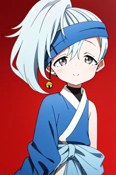 kunoichi_kikyou, grey eyes, grey hair, hair between eyes, ponytail, blue kimono, bike shorts, jingle bell