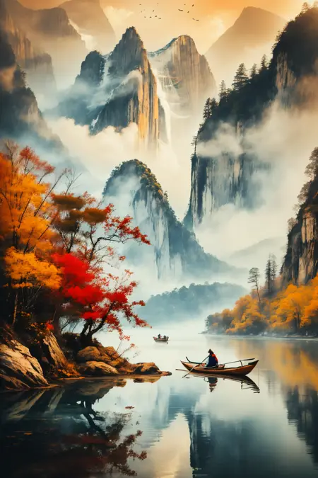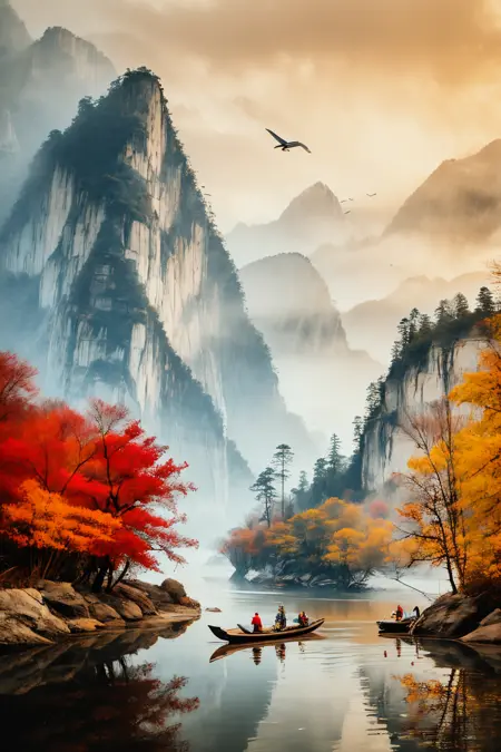 lora:1.5:0.9,shan,watercraf11t,boat,bird,tree,scenery,water,lake,mountain,outdoors,reflection,nature,river,