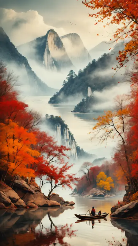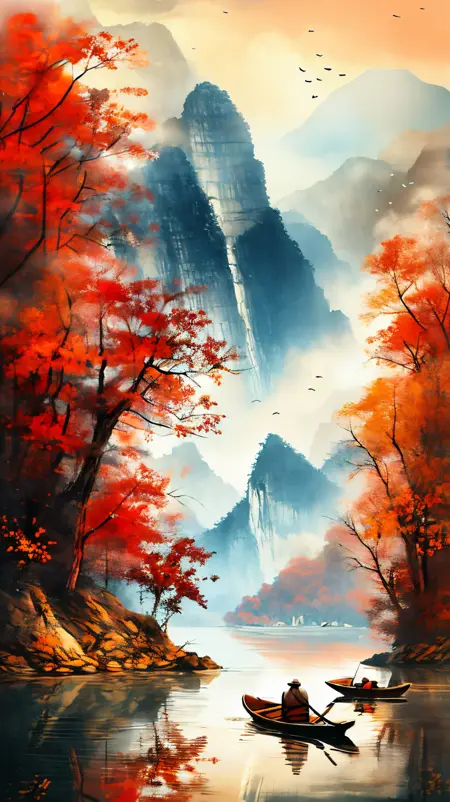 산과 강, 붉은 단풍 숲을 묘사하는 모델