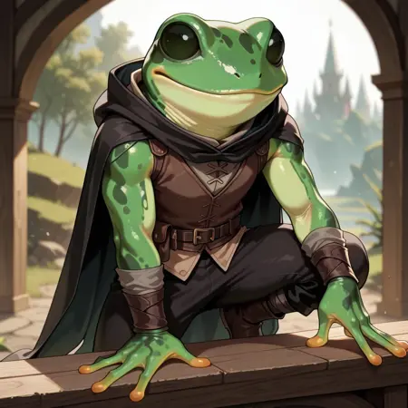 示例提示:grungrace, anthro frog, spots, long tongue, 1boy, male focus, green skin