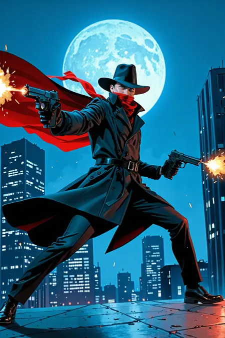 トリガー:theshdw、スカーフ、口元のスカーフ、マスク、フェドラ帽、短い髪、トレンチコート、マント、手袋、指輪、ズボン、靴