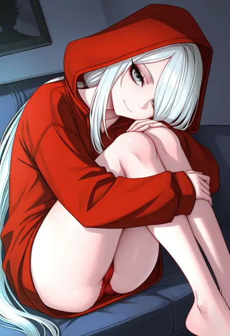 후드 뒤로, 신부용 장갑, 허벅지 부츠, 빨간 망토, 허벅지까지 긴 양말, 시청자 바라보기, 검은 신발, 보석, 후드가 달린 망토, 빨간 후드, 보석, 날카로운 신발, 빨간 코트레트, 빨간 코트