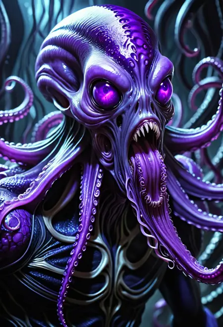 3. 엘드리치 공포에서 영감을 얻음, 영원히 해독 불가능, 촉수로 뒤덮인 얼굴, 끊임없이 움직이며 뒤틀리는 촉수, 입에서 뻗어나온 네 개의 긴 촉수, 위협적으로 앞으로 기울어짐, 안개 낀 초월적 공허, 어두운 가죽 같은 피부, 엘드리치 예언자, 불길한 예시, 약하게 빛나는 문양, 흐르는 마법적 실크, 그림자로 짜인 옷, 빛나는 정신적 눈, 늘어난 두개골, 정신적 문양 사이에 떠 있음, 잊혀진 자의 면보, 예지적 꿈길 걷기, 정신 에너지에 초점을 맞춘 강력한 마크로 촬영, 긴 의식용 망토, 날씬하고 외계인 같은 체형, 음영의 예언자, 진한 보라색, 희미하게 조명된, 공포에 영감을 받은 분위기, 엘드리치 지팡이, 흐르며 찢어진 천
