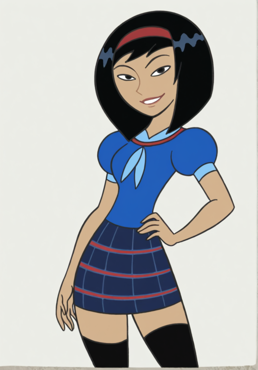 masterpiece, best quality, high quality, 1girl, KPYoriGirl, flat colors, parody, score_9, black hair, black eyes, red hairband, blue shirt, skirt, thigh highs.
