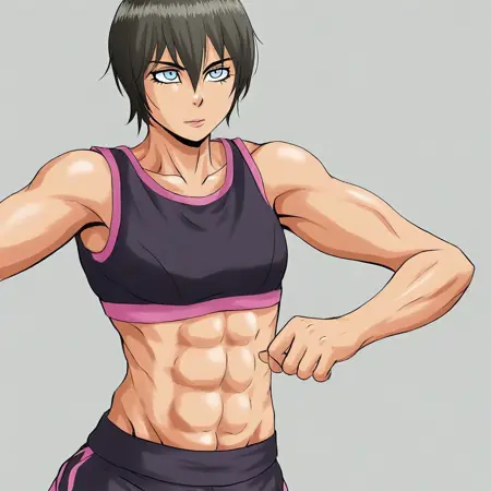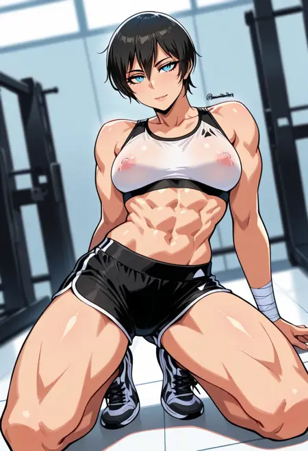 YaeSaotomeSSH, 1girl, solo, 근육질 여성, 톰보이, 단발, 검은 머리, 앞머리, 눈 사이의 머리카락, 파란 눈, 입, 후두뼈, 중간 크기의 가슴, 배꼽, 복부, 생식기, 복근, 측복근, 이두근, 두꺼운 허벅지, 근육질, 햇빛에 탄 피부, 스포츠 크롭탑, 헬스장 반바지, 운동화, 붕대,
