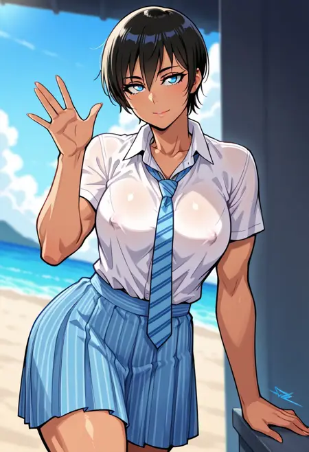 YaeSaotomeSSH, 1girl, solo, 근육질 여성, 톰보이, 단발, 검은 머리, 앞머리, 눈 사이의 머리카락, 파란 눈, 입, 후두뼈, 중간 크기의 가슴, 배꼽, 복부, 생식기, 복근, 측복근, 이두근, 두꺼운 허벅지, 근육질, 햇빛에 탄 피부, 흰 셔츠, 파란 줄무늬 치마, 줄무늬 넥타이, 신발,
