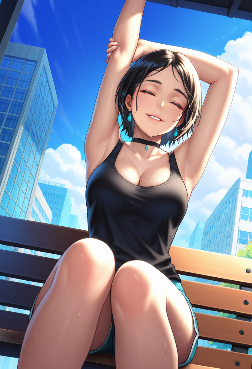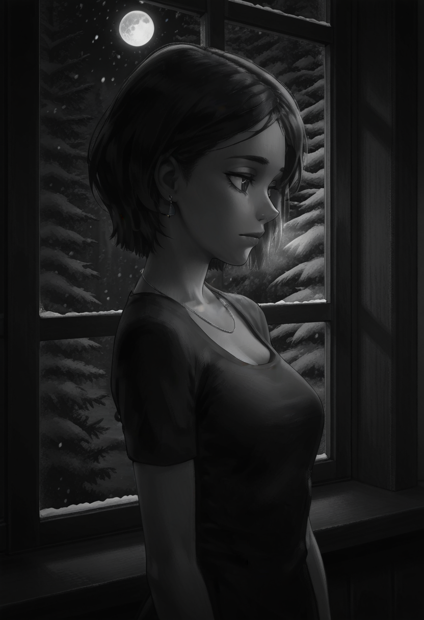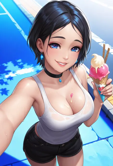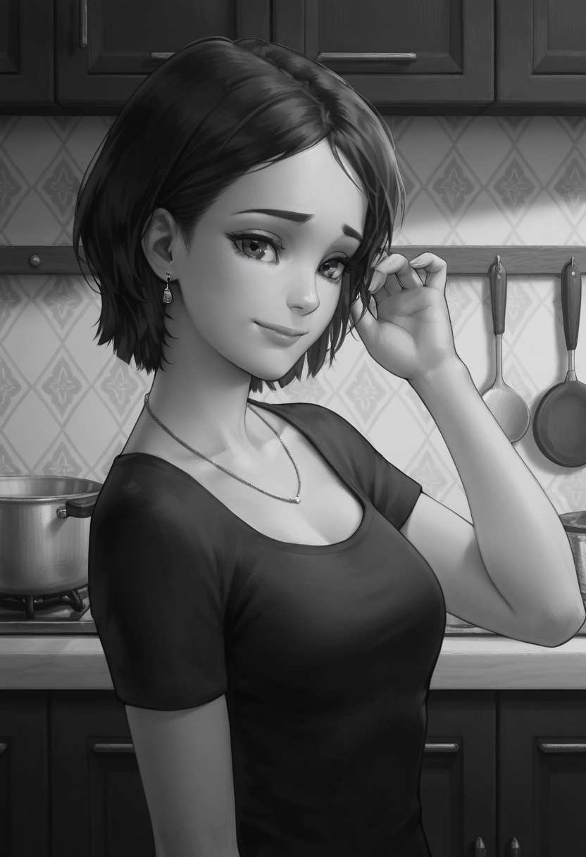 black hair, short hair, earrings, necklace, jewelry, black dress, short sleeves,