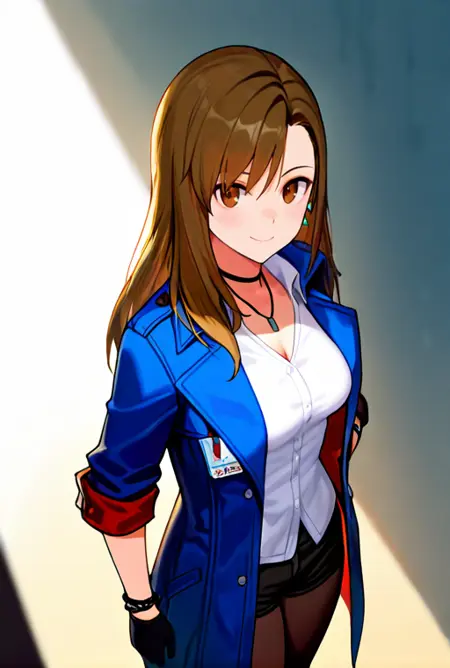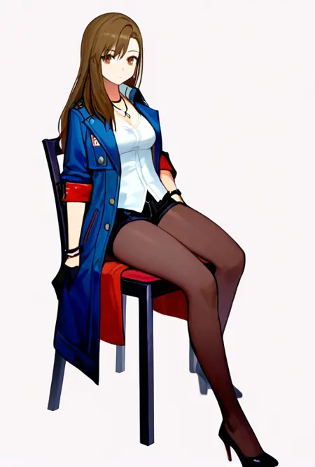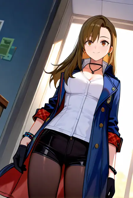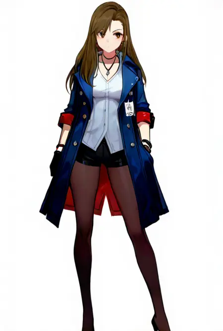 medium breasts, yujeongdef, white shirt, coat, choker, necklace, jewelry, unbuttoned, sleeves rolled up, bracelet, black gloves, black pantyhose, short shorts, black shorts, pantyhose under shorts, high heels,