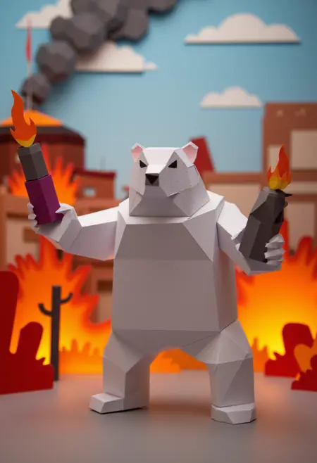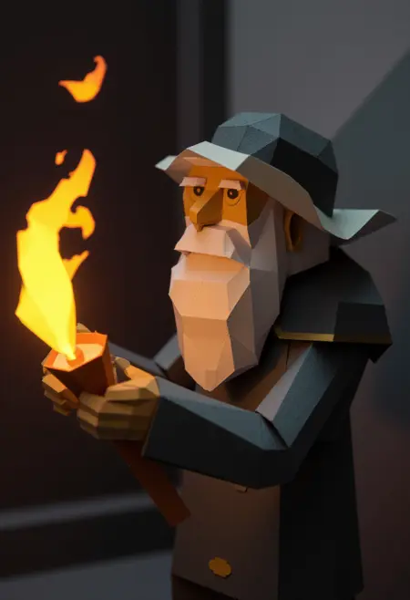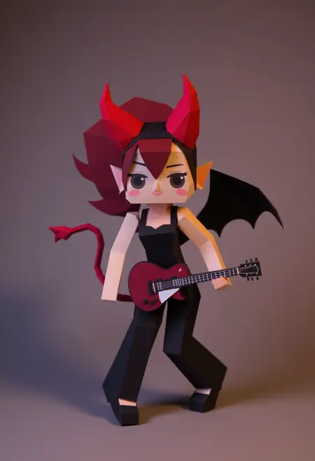 이 모델은 여러 접힘 부위에 작은 구멍이 있는 "수작업" 저폴리 종이 공예 장면의 이미지를 생성합니다.