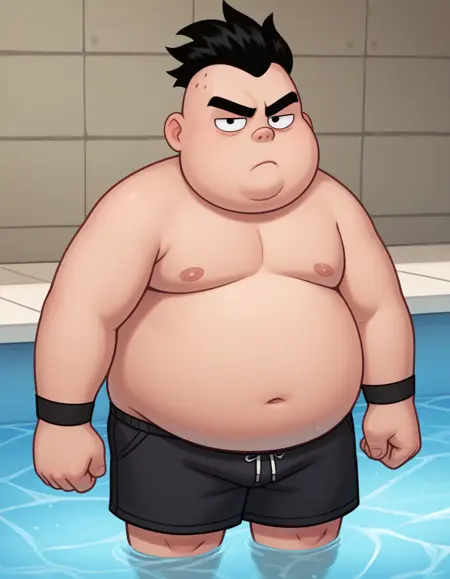 p1n3appl3, black eyes, human, black hair, spiky hair, thick eyebrows, 3 dots on side of head, lines under eyes, double chin, fat, plump, obese, 1boy, male