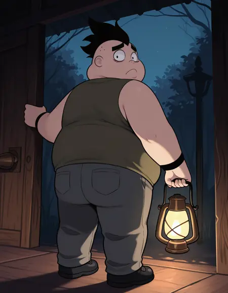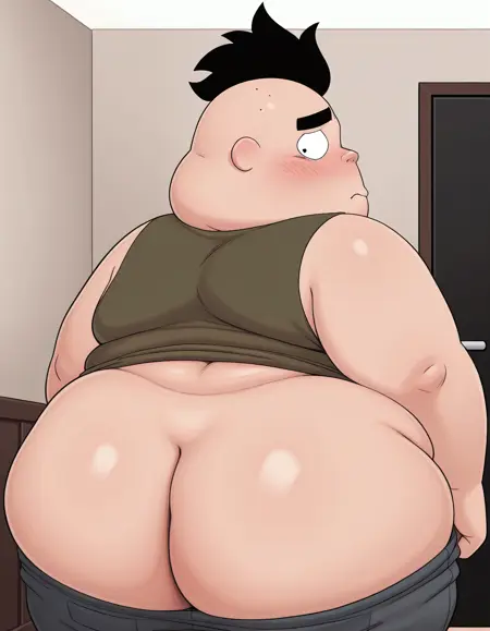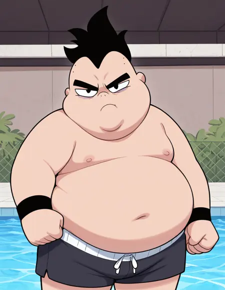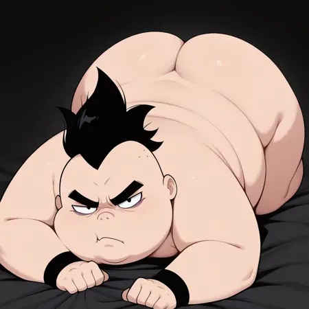 black eyes, nostrils, black hair, spiky hair, thick eyebrows, 3 dots on side of head, lines under eyes, double chin, fat, plump, obese, 1boy, male