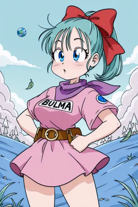 불라 브리프스(드래곤볼): 청록색 머리, 빨간 리본, 머리 리본, 불라, 갈색 허리 끈, 분홍 상의, 분홍 치마, 보라색 두건, 꼬리머리,
