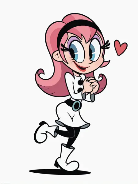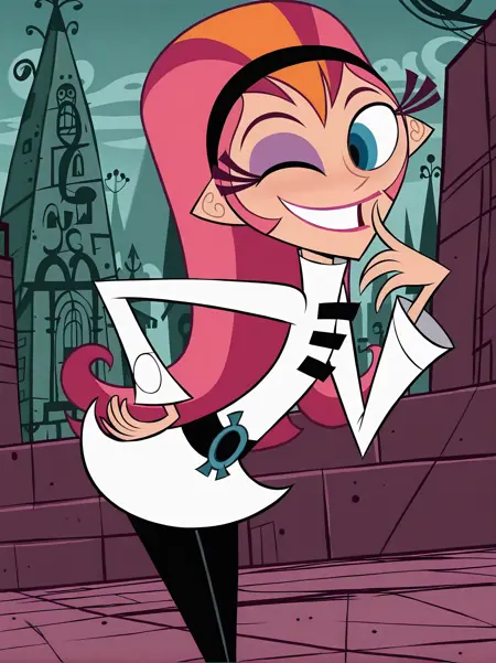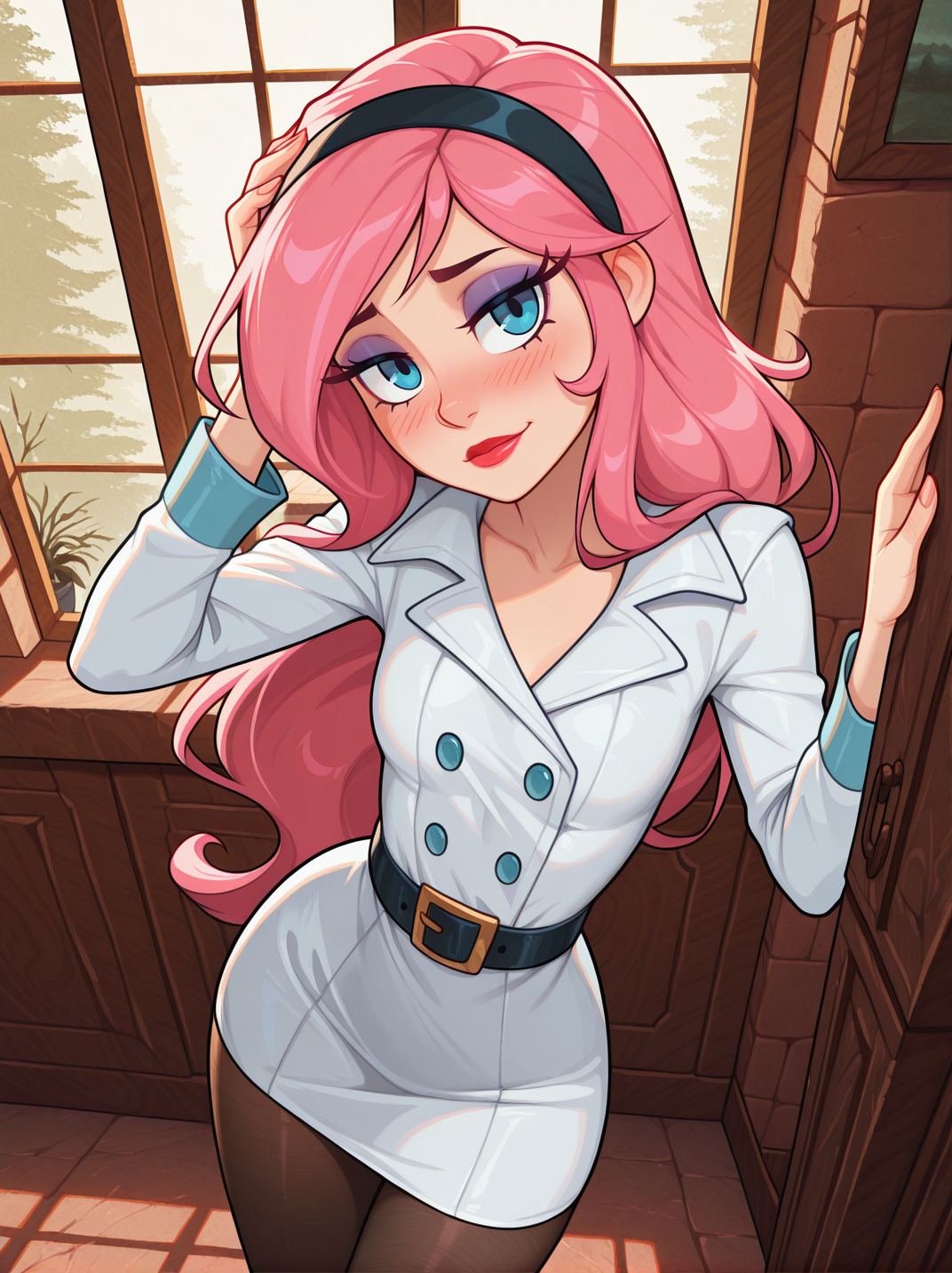 Agent Xero: "분홍색 긴 머리, 파란 눈, 메이크업, 빨간 립스틱, 검은 팬티후스, 코트 드레스, 긴 소매, 흰 드레스, 헤어밴드, 벨트"