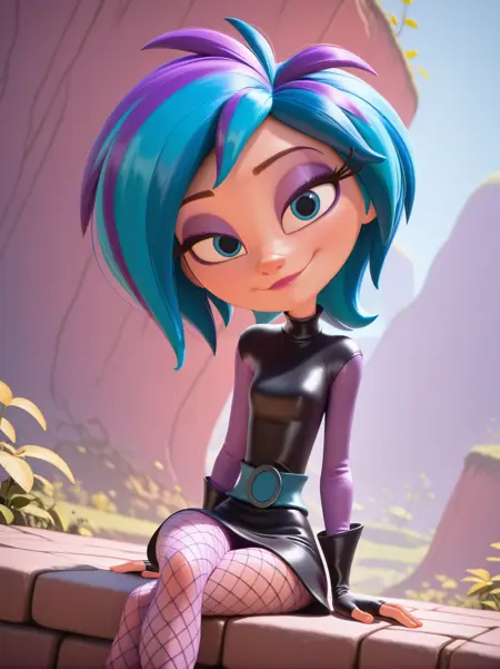 Lacey Shadows: "파란 눈, 다색 머리, 파란색 단발, 메이크업, 아이섀도우, 검은 손가락 없는 장갑, 보라색 피쉬넷, 검은 드레스, 짧은 드레스, 보라색 긴 소매"