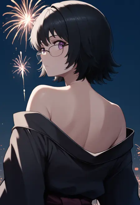 触发词 + 外貌: mur4saki, 腹部纹身, 短发, 黑发, 紫色眼睛