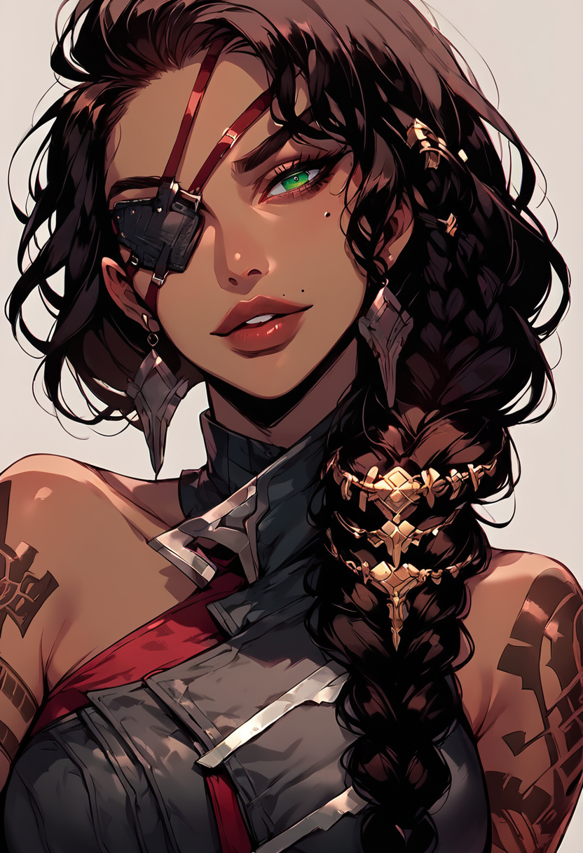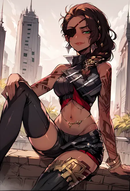 주요 프롬프트: 1girl, solo, eyepatch, brown hair, dark-skinned female, tattoo, braid, looking at viewer, green eyes, mole, lips, asymmetrical legwear, black shorts, navel,