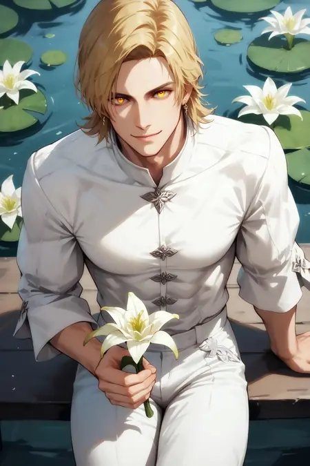 Dion Prompts : 1boy, male, blonde hair, short hair, yellow eyes, parted bangs, earrings