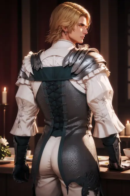 Armor Outfit : plate armor, armor, shoulder armor, pauldrons, gloves, gauntlets, pants, white pants, long sleeves