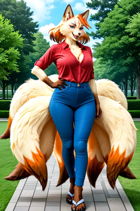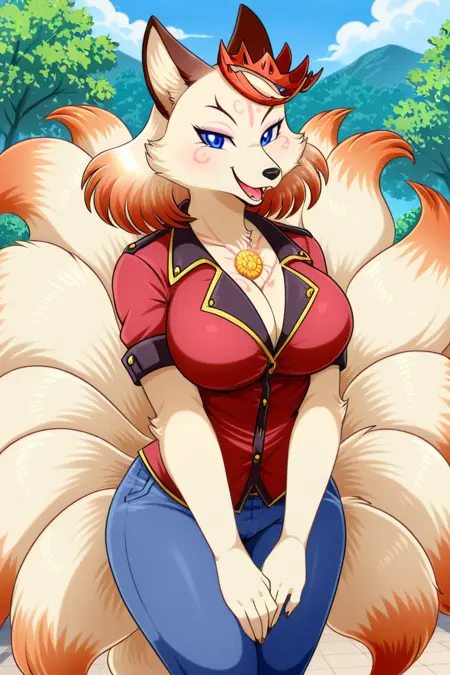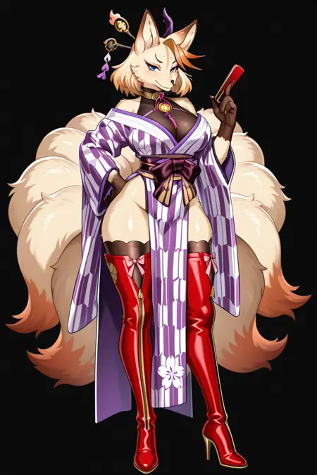 标签: hakumen_(housamo), 人形, 狐狸女性, 九尾狐, 九尾, 多条尾巴, 九条尾巴, 狐尾, 狐耳, 蓝眼睛, 分叉眉毛, 多色头发,