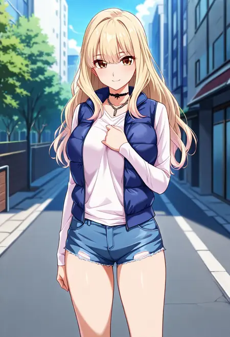 Ainavest, 파란색 조끼, 열린 조끼, 흰색 셔츠, 긴 소매, 데님 반바지, 짧은 반바지, 초커, 체인 목걸이