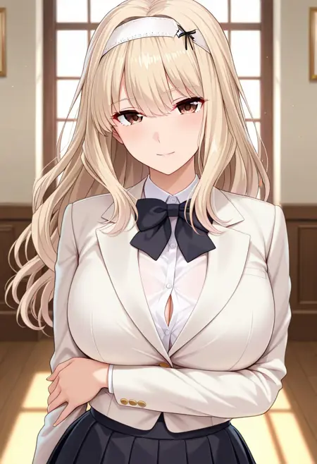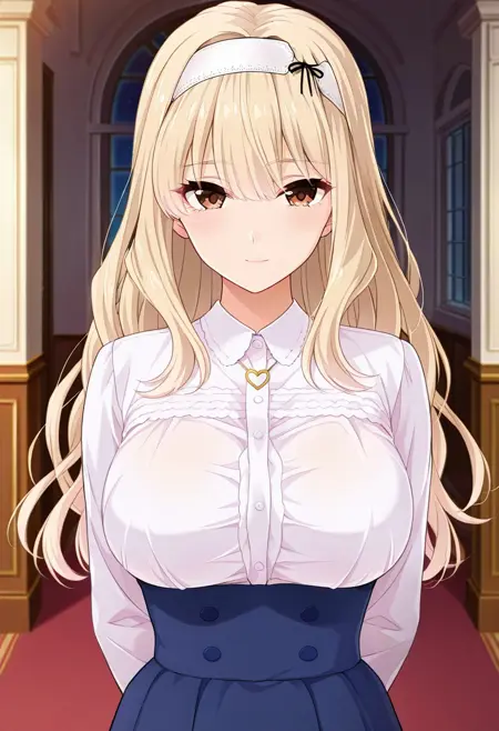 갈색 눈, 금발, 긴 머리, 흰색 머리띠, 파동 모양의 머리