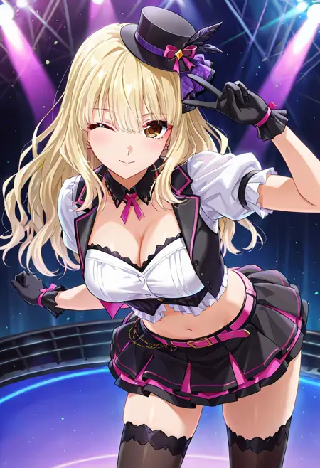 Ainaidol, 검은 조끼, 열린 조끼, 검은 치마, 분리형 칼라, 보라색 모자 리본, 분홍색 벨트, 갈색 중간 길이 부츠, 검은 장갑