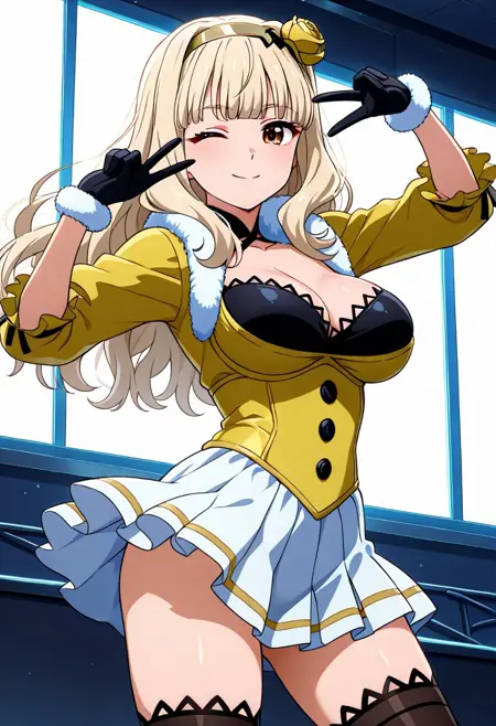 Takanoble, 검은 부디스, 금색 장미 머리띠, 노란색 소매, 검은 장갑, 검은 허벅지 양말