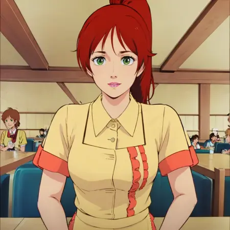 waitress, yellow uniform, collared dress, buttons, short sleeves, layered sleeves, apron, frill,