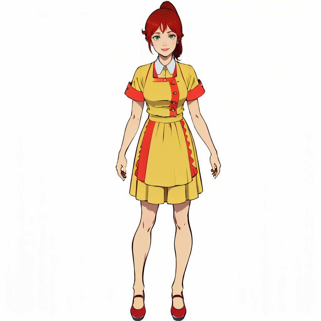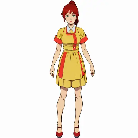 waitress,yellow uniform,collared dress,buttons,short sleeves,layered sleeves,apron,frill,