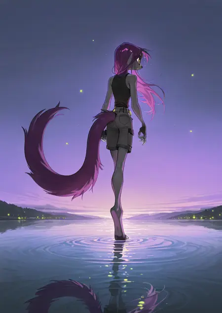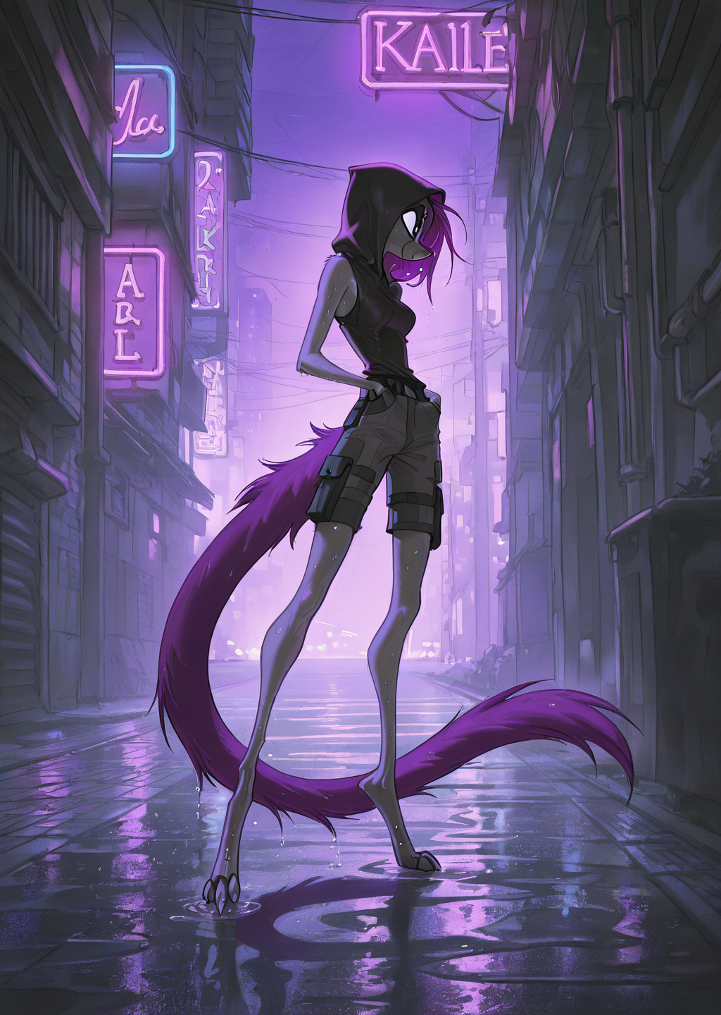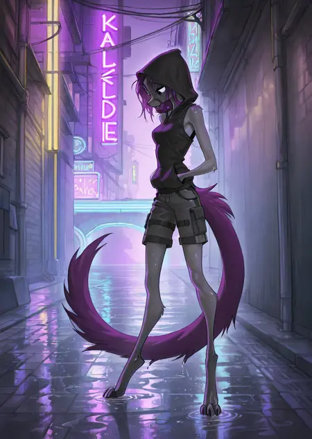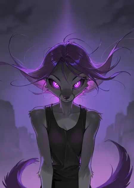 Kalei: 앤트로, 긴 보라색 머리카락, 크고 풍성한 보라색 꼬리, 회색 털, 더 어두운 회색 다리, 디지티그레이드 다리, 파란 눈, 귀,