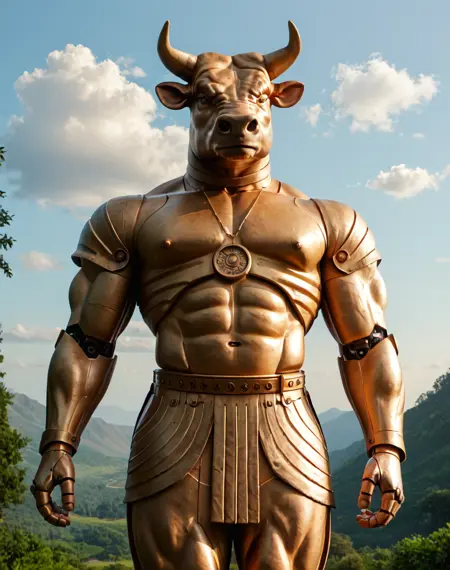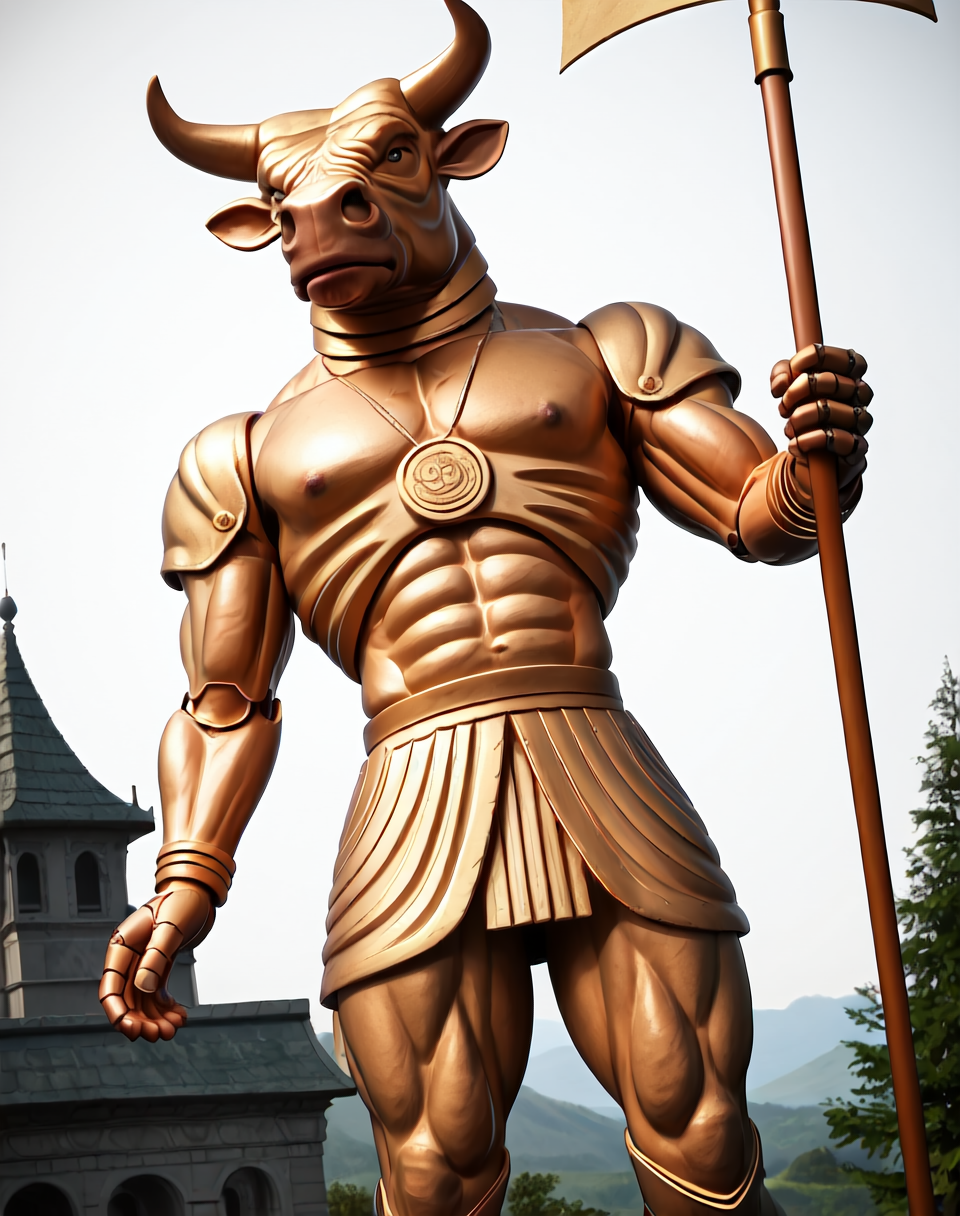 此Lora的提示词为(Minoton, minotaur, bull, muscular, robot, mecha)。添加额外的提示词如(metal body, bronze)有助于图像生成,因为有时生成的结果会显示角色有皮肤而非金属身体。