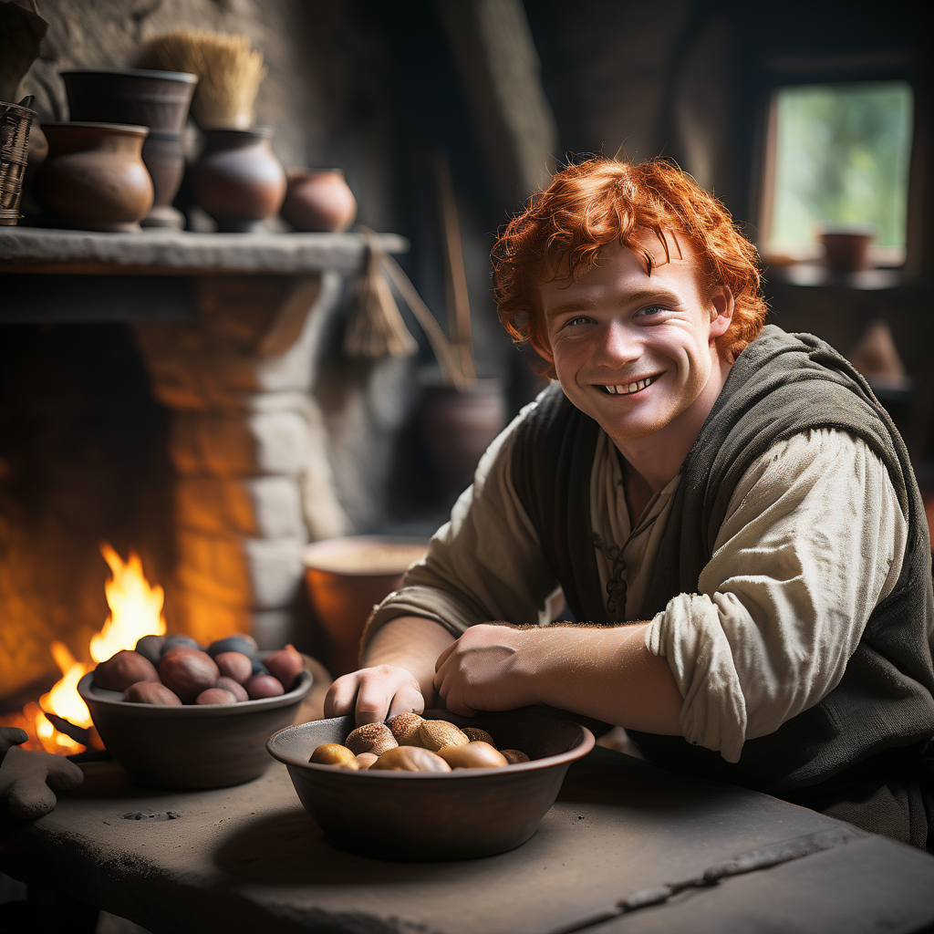 1boy, 1girl, 2boys, 3boys, apple, apron, bald, bandages, bare arms, basket, black hair, blonde hair, blue eyes, blurry, blurry background, blurry foreground, book, book stack, bookshelf, bowl, braid, bread, breasts, brown eyes, brown hair, brown vest, bug, candle, cat, chair, cleavage, closed eyes, closed mouth, coin, collared shirt, cooking, cup, curly hair, dark skin, depth of field, dirty, dirty face, dress, facial hair, fat, fat man, fine art parody, fire, fireplace, food, freckles, fruit, frying pan, gloves, grey hair, grin, hobbit, holding, holding book, indoors, jewelry, kitchen, knife, lamp, large breasts, lips, long hair, long sleeves, looking at viewer, male focus, medium breasts, messy hair, mug, multiple boys, mustache, necklace, necktie, nose, old, old man, old woman, open book, open mouth, orange hair, potato, quill, reading, realistic, red hair, shirt, short hair, short sleeves, sink, sitting, skirt, sleeveless, sleeves rolled up, smile, solo, solo focus, squatting, stove, table, tank top, teeth, tongue, tongue out, ugly man, upper body, vest, wavy hair, weapon, white dress, white hair, white shirt, white tank top, wrinkled skin